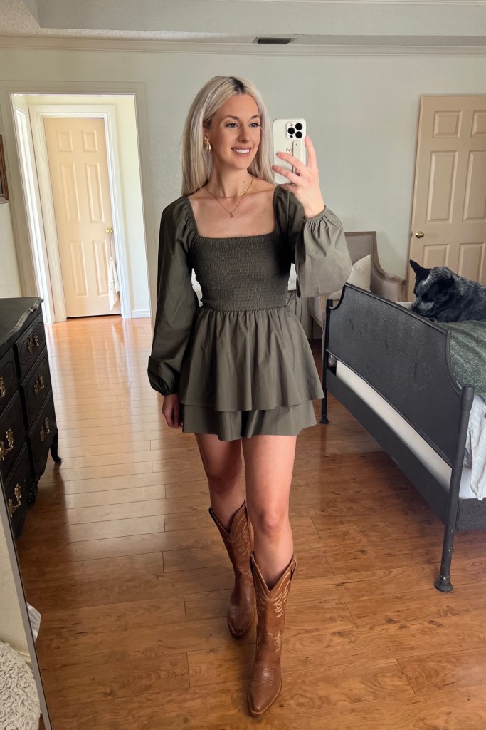 It’s still pretty warm here in Southern Texas. Today I’m working on things around the house and going to take a look at Christmas decor. I love this romper because it looks like a dress and has bell sleeve detail which makes it perfect for running errands.